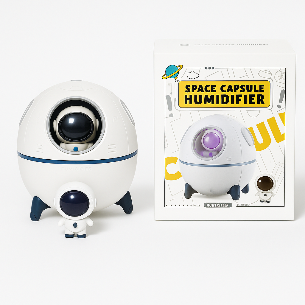 Difusor blanco, inspirado en una nave espacial. Incluye figura de astronauta, luz LED y conexión USB.
