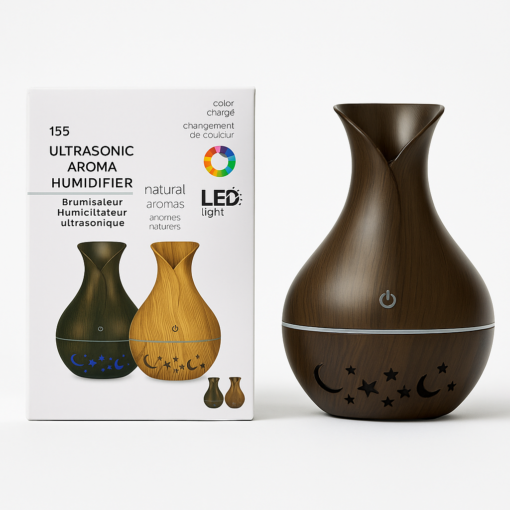 Difusor en madera oscura con forma de florero con luces LED y conexión USB.