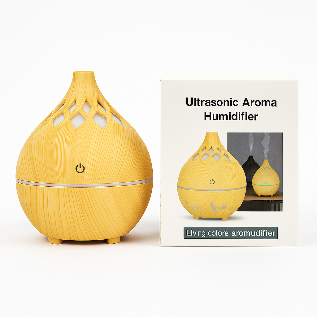 Difusor en madera clara con diseño floral calado. Conexión USB y funcionamiento silencioso.