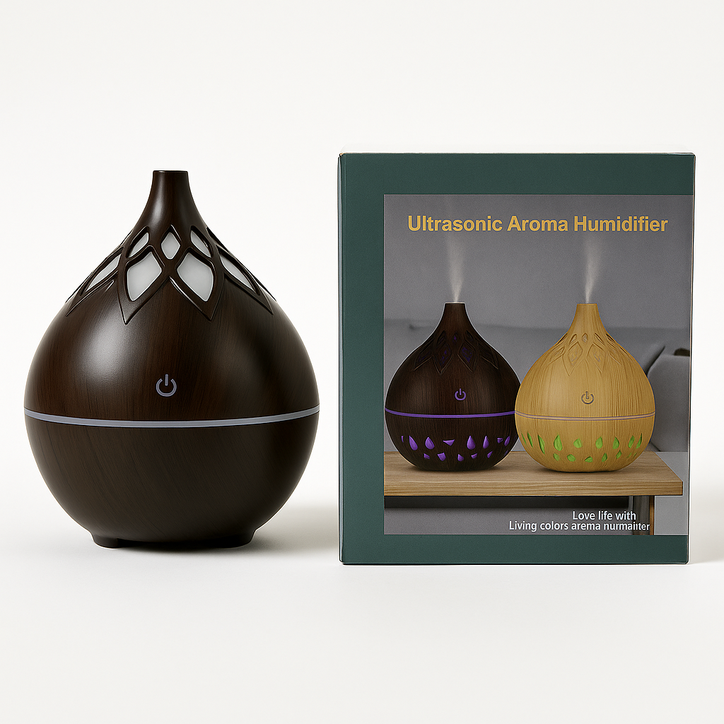 Difusor en madera oscura con diseño floral calado. Conexión USB y funcionamiento silencioso.